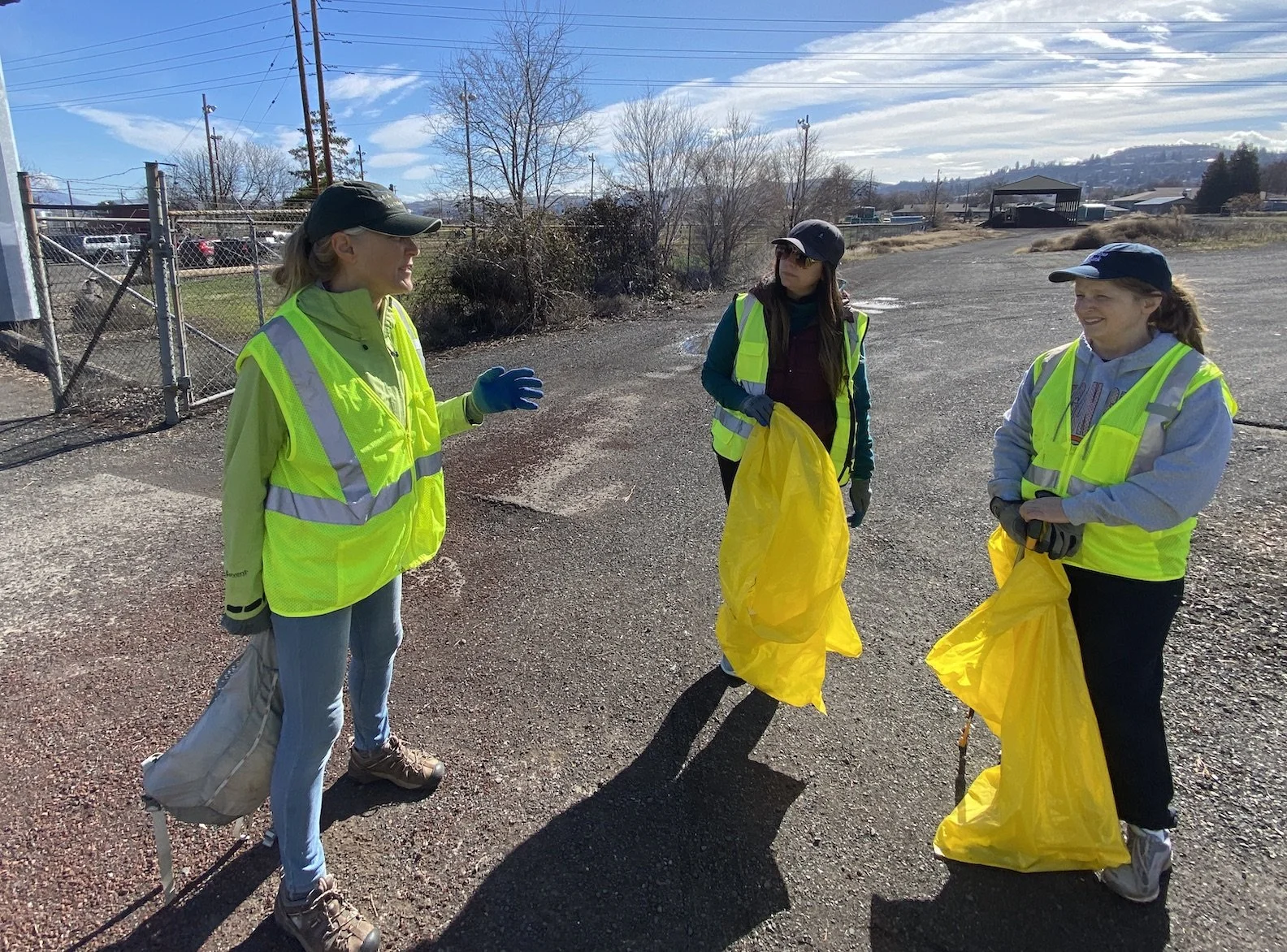 Connie Krummrich with The Dalles Beautification Committee chats with Carmen Myers and Sandi Smith about removing litter and other items from the dugouts. They are used at times for shelter by people who are houseless. Volunteers were asked to be observant when picking items up as they may still be of use to those that left them behind.